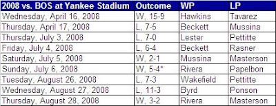 Ah, 2009. As we all know, the Yankees started the year 0-8 vs. Boston, but boy did the team ever turn things around in their sparkling second half, sweeping the Sox in both home series they played and ending the year with a 7-2 record against the Sox at new Yankee Stadium.