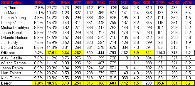 In the outfield the Yankees boast three players with 3.0-plus yWARs in , and . The Twins counter with , and . While Young and Kubel are solid offensive threats, they give a lot of their value back on defense, as evi
