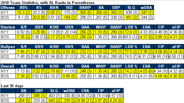 The Sox boast some unexpectedly strong overall team numbers over the last 30 days for a team that’s gone 13-14 in September, besting the Yankees in all seven of the above-listed categories except OBP. Obviously the 4.56 team ERA has a lot to do with Boston’s middling play.