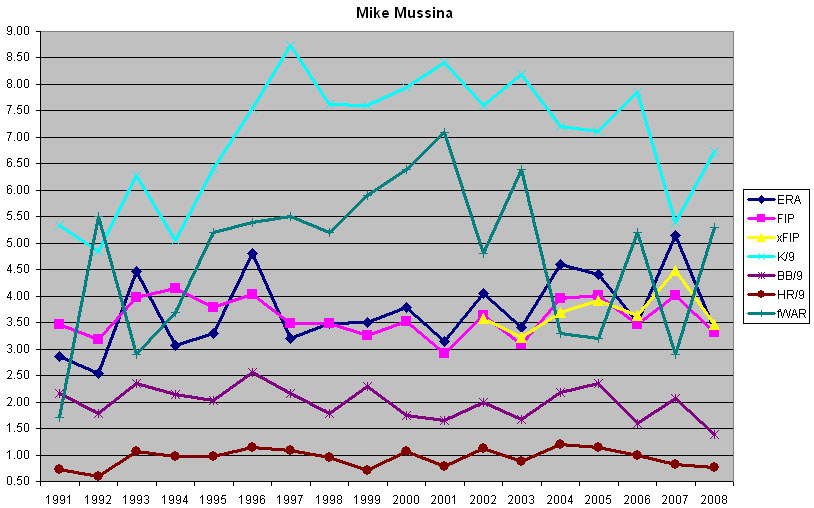 I was a huge Moose fan early in his contract, and then like many fans, was very disappointed by his 2004 and 2005 campaigns. I didn’t completely understand just how great a pitcher he was until later on either – he’s one of those guys, due to a combination of the era he pitched in, the division he pitched in, and his series of just-misses (just missing a perfecto, just missing a World Championship, just missing 300 wins, just missing a Cy Young, and up until his last season, just missing a 20-win season), that fans terribly underrate, especially when using “traditional” methods of analysis.