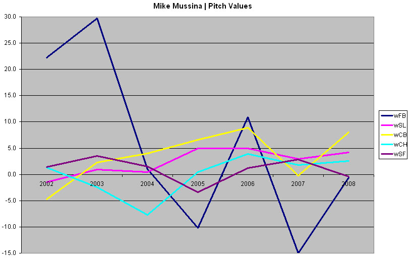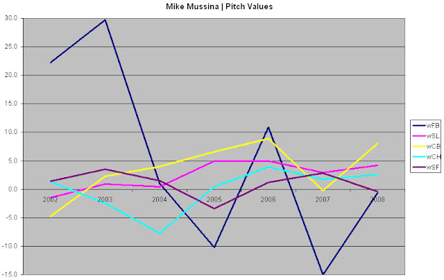 Moose had the third-best fastball in all of baseball in 2003, at 29.7 runs above average, but the only time he’d reach even 10 runs above average with any of his other pitches in subsequent seasons was in 2006, with a wFB of 10.9 runs above average.