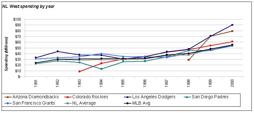 The Dodgers were fairly steadfast in leading the league at $46.9M, although in the final two years surveyed, their total spiked rather precipitously (thanks in large part to and NY “fan-favorite” Kevin Brown). Unfortunately for the LA faithful, the team had relatively little to show for it. Thankfully, the Padres, who were fourth in total spending, were content in taking the majority of losses over the course of these years, and graciously accepted/embraced their one playoff appearance.